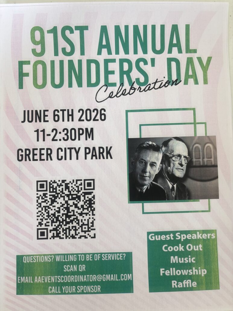 Location Greer City Park 301 E Poinsett St, Greer, SC 29651 Date Jun 06 2026 Time 11:00 am - 2:30 pm 91st Founders Day Celebration 91st Founders Day Celebration Speakers, cook out, raffle, sobriety countdown Share this event + Add to Google Calendar + iCal / Outlook export