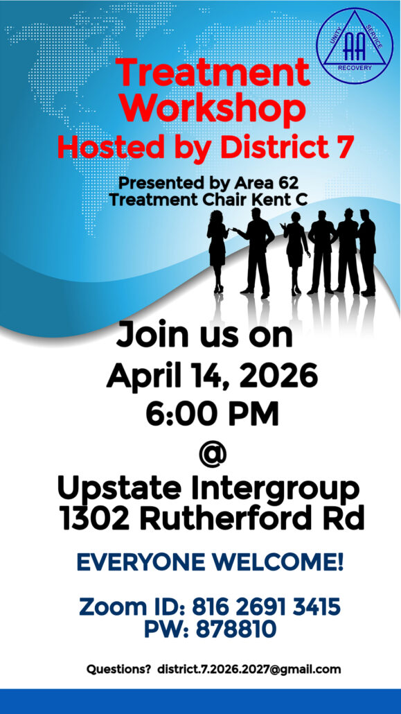 Location Intergroup Office 1302 Rutherford Rd Greenville, SC 29609 USA Category District Events Date Apr 14 2026 Expired! Time 6:00 pm - 7:30 pm Treatment Committee Workshop Treatment Committee Workshop presented by Area 62 Treatment Chair Hosted by District 7 Everyone is Welcome! Share this event + Add to Google Calendar + iCal / Outlook export